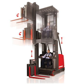 Uso: Para almacenes cerrados con superficies lisas o pavimentadas. Operan en pasillos ultra angostos (1.74 mts) almacenando y seleccionando tarimas a alturas hasta de 12mts. El mástil u horquillas rotatorias permiten que el montacargas pueda estibar sin dar vuelta. El operador puede subir con la plataforma para ver la carga a manipularse (sistema man up/ hombre arriba). Las unidades con man down/ hombre abajo, son operadas a nivel de piso y también tienen mástiles trilaterales para estribar sin girar. Excelente para áreas cerradas donde se requieren bajas emisiones de contaminantes, hay poca ventilación o existe personal trabajando. Requieren de una batería industrial con ciclos de 8 horas de trabajo, 8 horas de carga, 8 horas de enfriamiento y un cargador.